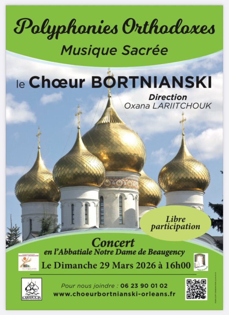 Le Chœur Bortnianski, dirigé par Oxana Lariitchouk, présentera un concert de polyphonies orthodoxes en l’Abbatiale Notre-Dame, le dimanche 29 mars à 16h.